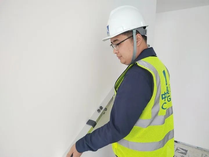 他的工作與瓷磚、膩?zhàn)?、水泥打交道,需要時(shí)刻手拿靠尺、角尺等檢測工具對項(xiàng)目乳膠漆墻面進(jìn)行實(shí)測實(shí)量;手拿空鼓錘對現(xiàn)場墻磚進(jìn)行空鼓排查,對每個(gè)部位全面排查、查找隱患,保證施工質(zhì)量。這樣的檢測動(dòng)作,每天要重復(fù)上千次,就是為了優(yōu)質(zhì)履約,為業(yè)主提供一個(gè)安全住所。