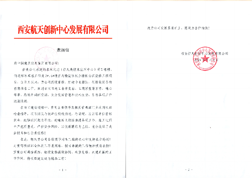 近日,西安航天創(chuàng)新中心發(fā)展有限公司向中國建技發(fā)來表揚(yáng)信,充分肯定中國建技“未來之芯”項(xiàng)目部的工作,對(duì)中國建技高質(zhì)量推進(jìn)項(xiàng)目建設(shè)、優(yōu)質(zhì)履約給予高度評(píng)價(jià)。