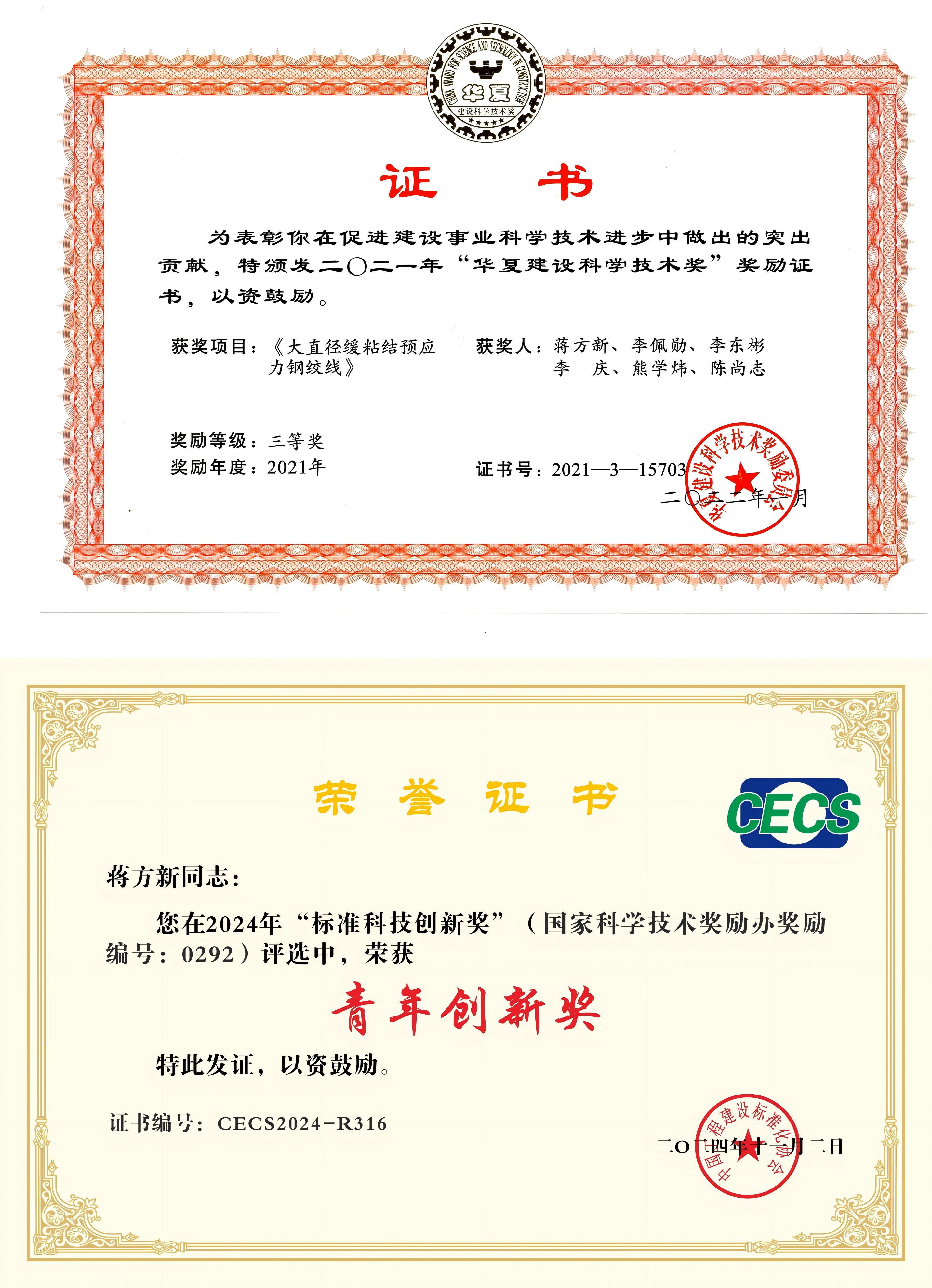 蔣方新帶領團隊成功研發(fā)大直徑緩粘結預應力材料、濕氣型緩粘結預應力材料、高粘抗?jié)B緩粘結預應力材料、緩粘結預應力錨桿及超高強預應力材料,并成功開發(fā)配套錨具及張拉機具設備等。所研發(fā)新型預應力材料形成了完備的技術體系,處于國內(nèi)領先、國際先進水平,相關產(chǎn)品取得北京市新技術新產(chǎn)品認證。