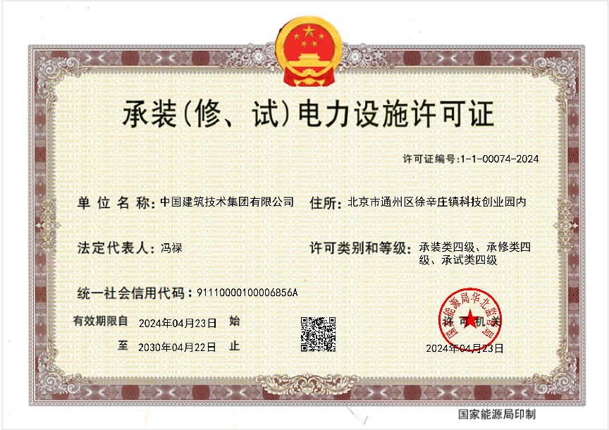 4月23日,經(jīng)北京市住房和城鄉(xiāng)建設(shè)委員會(huì)、國家能源局華北監(jiān)管局核準(zhǔn),中國建技申報(bào)的電力工程施工總承包貳級(jí)、環(huán)保工程專業(yè)承包貳級(jí)、承裝(修、試)電力設(shè)施許可證(四級(jí))三項(xiàng)資質(zhì)成功獲批。