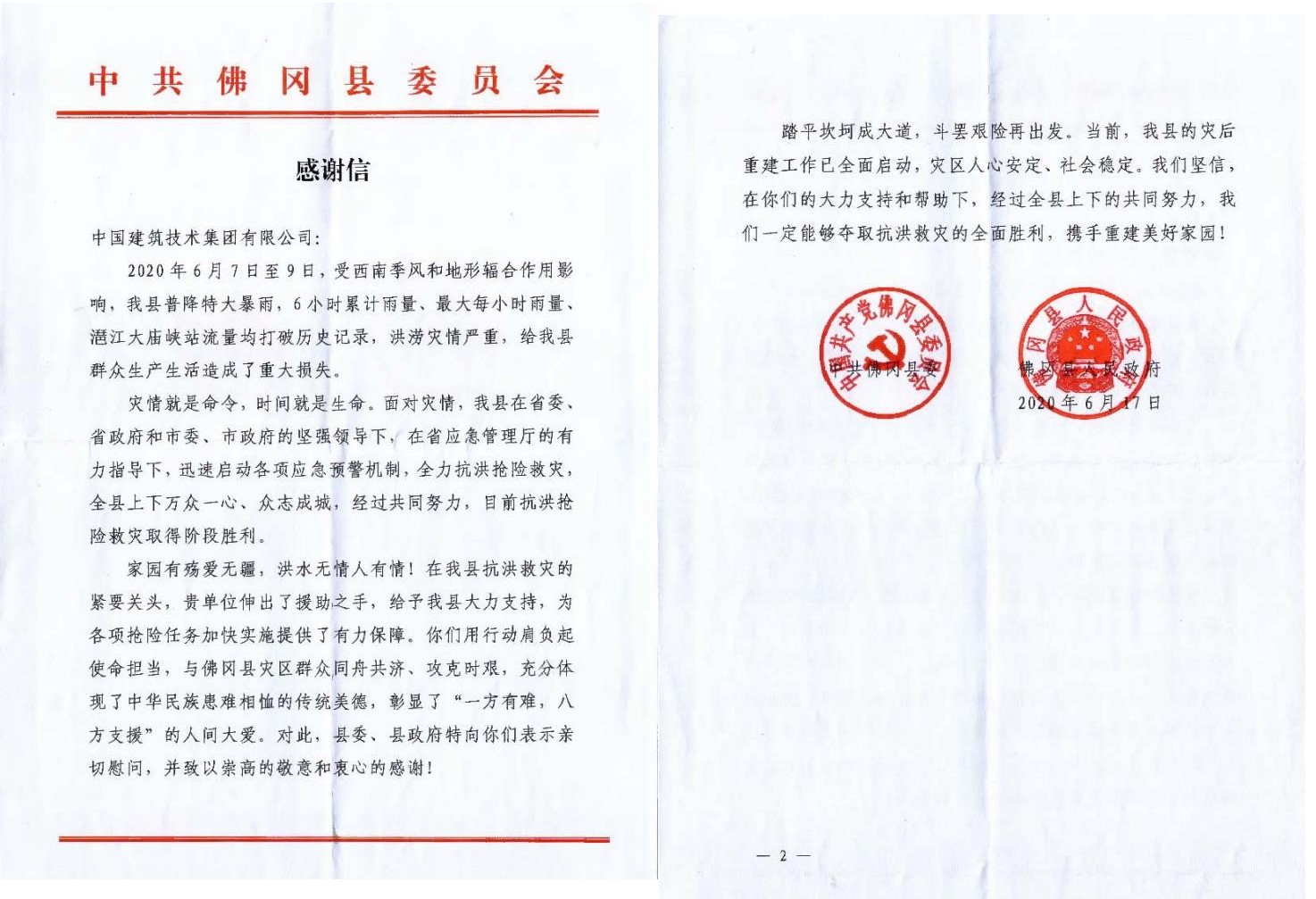 6月17日、6月23日第六工程分公司清遠恒大御泉四季花園總承包項目部及第六工程分公司黨支部接連收到了清遠市中共佛岡縣委、佛岡縣人民政府、中共洛洞村總支部委員會的感謝信,感謝信內(nèi)容主要是針對中技集團清遠恒大御泉四季花園總承包項目部及第六工程分公司黨支部在6月7日至6月9日清遠市佛岡縣發(fā)生的50年一遇的洪災中做出的巨大貢獻表示真誠的感謝。?