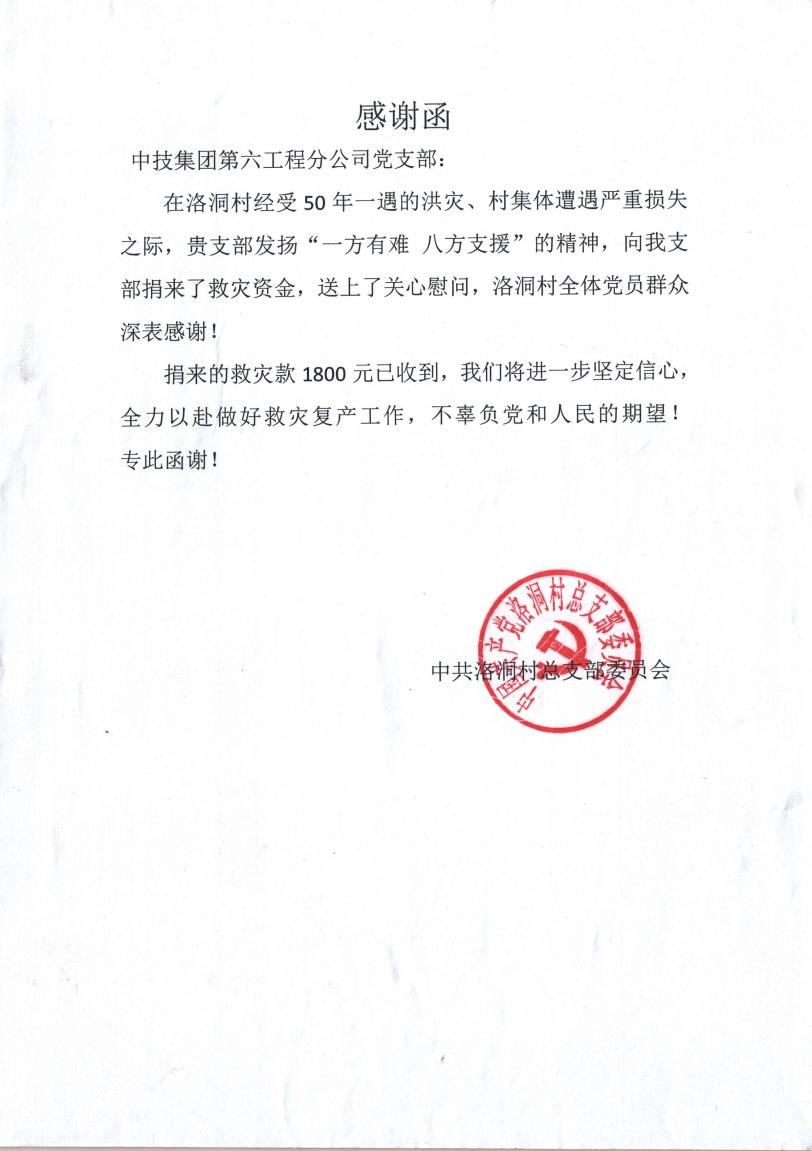 災區(qū)黨委及政府為感謝我司及六分黨支部在災情中的巨大貢獻特致感謝信,高度贊許我們“用行動肩負起使命擔當”,表達了對我司“一方有難,八方支援”幫助受災的湯塘同胞度過難關的感激情懷,同時對我司和六分黨支部組織的“情系湯塘,搶險救災,愛心捐贈”活動以及為災區(qū)所捐的物資和款項表示由衷的感謝!