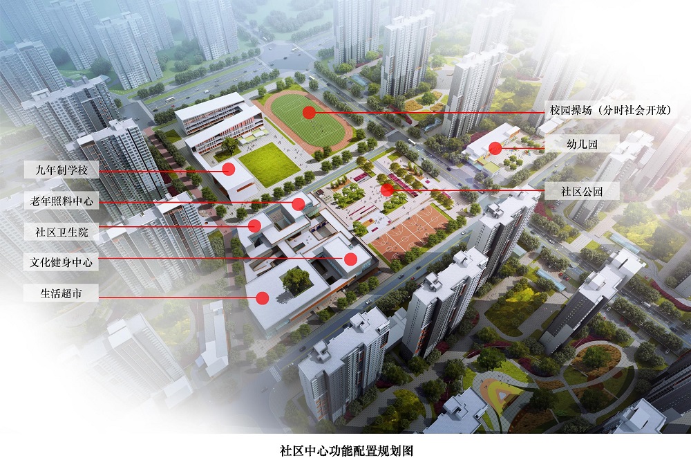 將生活超市、文化娛樂、全民健身、社區(qū)醫(yī)療、老年照料、九年制學校、社區(qū)公園、幼兒園和管理服務等社區(qū)類級的公共設(shè)施相對集中或鄰近布局,實現(xiàn)了便利化使用和規(guī)?;?jīng)營的雙重目標。規(guī)劃同時兼顧設(shè)施抗擾和共享平衡的問題:醫(yī)療、養(yǎng)老相互結(jié)合,教學設(shè)施相對獨立,學校操場臨近社區(qū)公園和文體中心布置,方便對外開放和聯(lián)動使用。