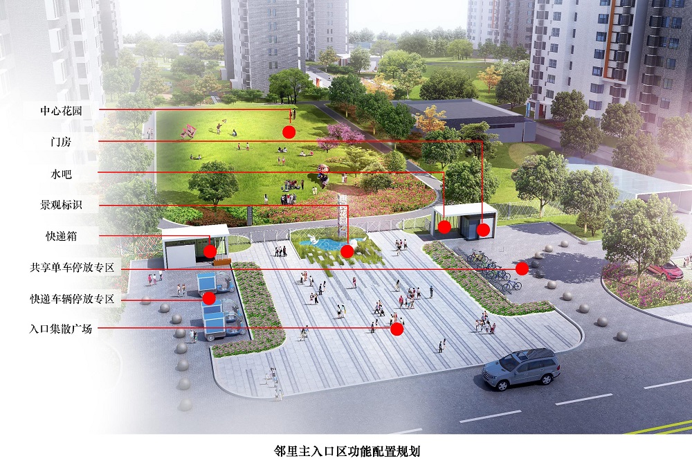 主入口實行人車分流組織,設(shè)置集散廣場、景觀標識和中心花園。精細化布局門房、快遞箱、水吧、共享單車與快遞車輛停放專區(qū),形成功能強大的新型住區(qū)入口服務系統(tǒng)。