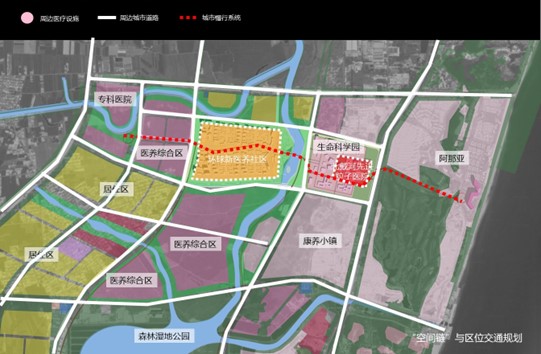 本項(xiàng)規(guī)劃以產(chǎn)業(yè)功能布局的需求為基礎(chǔ),試圖通過“空間鏈”的規(guī)劃方法,將本規(guī)劃區(qū)納入核心區(qū)大醫(yī)養(yǎng)功能區(qū)中,形成開放的城市空間系統(tǒng),通過交通、景觀及區(qū)劃融合的方式,促進(jìn)本醫(yī)養(yǎng)社區(qū)與生命科學(xué)園、周邊醫(yī)養(yǎng)綜合區(qū)、濱海度假區(qū)之間的空間聯(lián)系和產(chǎn)業(yè)互動(dòng)。