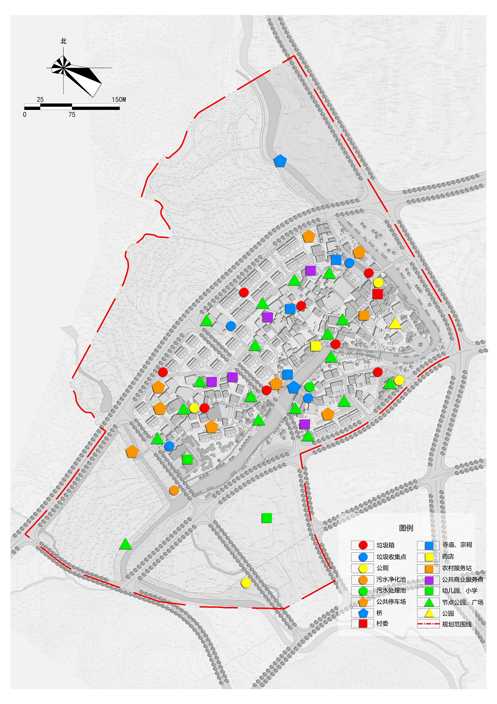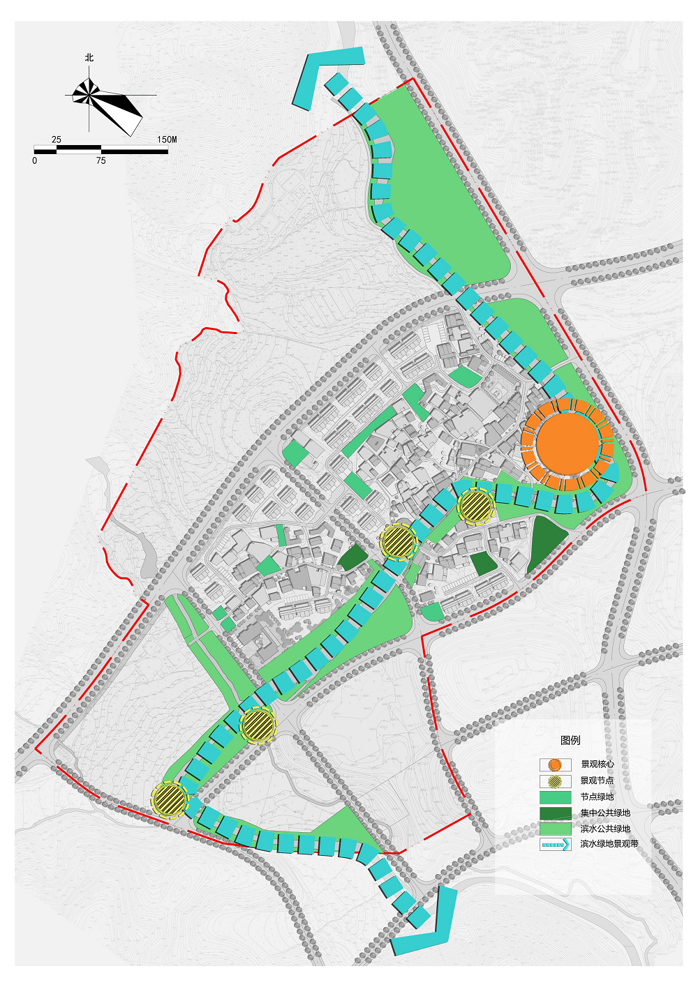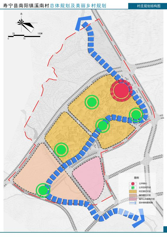 (1)結(jié)構(gòu):村莊建設發(fā)展區(qū)規(guī)劃形成“一核、一帶、五片、多點”——?一核:以村委、村民文化活動公園所形成的公共核心;一帶:沿溪南村傍村而過的溪南溪所形成的濱水綠地景觀帶;五片:①依據(jù)建設情況劃分成的北部村莊居住片區(qū);②中部村莊居住片區(qū);③南部村莊居住片區(qū)與村;④西南部城市居住片區(qū);⑤城市公共服務片區(qū)