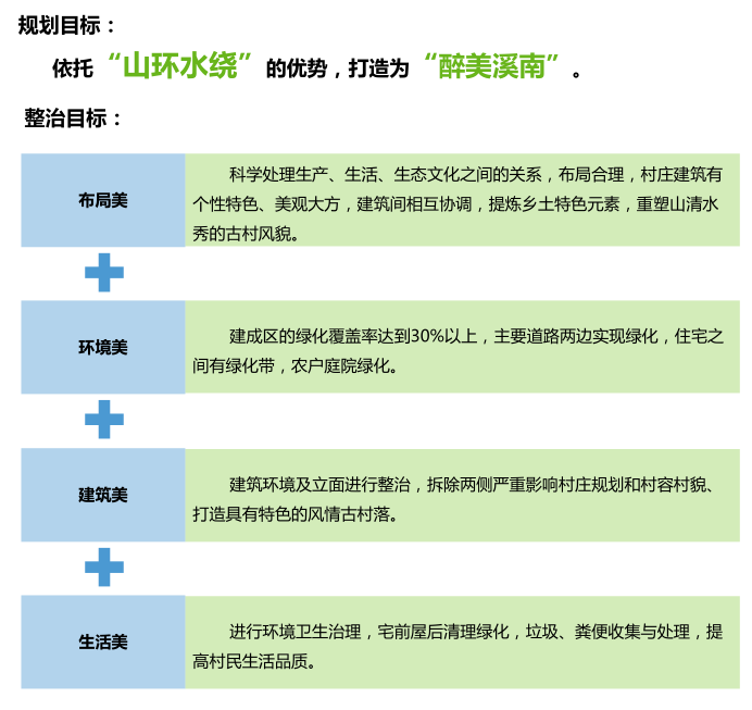 規(guī)劃目標:依托“山環(huán)水繞”的優(yōu)勢,打造“醉美溪南”。整治目標:建設“布局美、環(huán)境美、建筑美、生活美”的“四美”溪南。