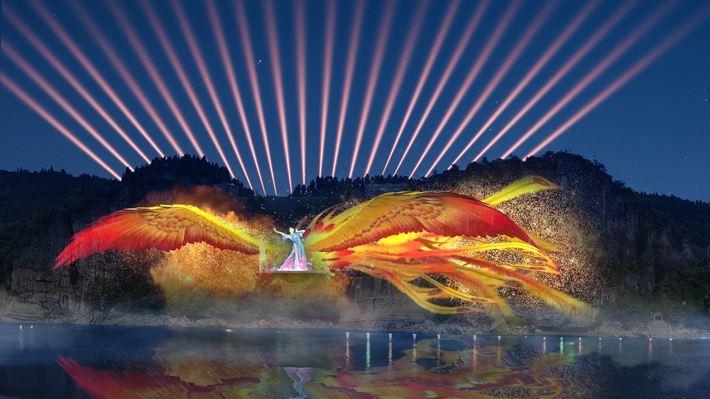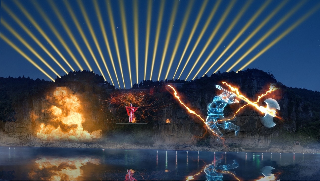 崖壁5D燈光秀尤為新穎,采用“崖壁投影+舞臺演繹”的方式,以兩側(cè)崖壁為投影載體,中間布置小舞臺配合燈光矩陣,將辛女與盤瓠的凄美愛情故事和妖怪來襲國破山河場面,將軍點(diǎn)兵出征的戲劇場面演繹得活靈活現(xiàn)。