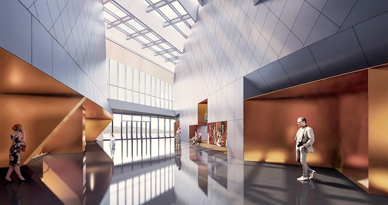 建筑方案以“海上帆、風中翼、云上錦”為總體設(shè)計理念,采用“一體兩翼”的規(guī)劃格局,力求以鮮明獨特的建筑形象,充分展現(xiàn)在建設(shè)自貿(mào)港這一新時代背景下海南地域文化的“展示與弘揚、傳播與交流、騰飛與發(fā)展”。整體建筑造型如海上揚帆的造型高低錯落呼應(yīng),建筑形體面向東側(cè)城市廣場開敞,又如張開的親和雙臂,將漫步人群攬入其中,把從西北西南街角引入的城市人群,會聚于建筑中心設(shè)有共享、咖啡、新聞發(fā)布等休閑互動區(qū)的“城市文化客廳”,并將建筑空間自然劃分為南北兩翼,即位于北側(cè)的瓊劇會館劇場與南側(cè)的非遺藝術(shù)博物館區(qū),宛如展翅欲飛的“風中雙翼”,迎海上來風。