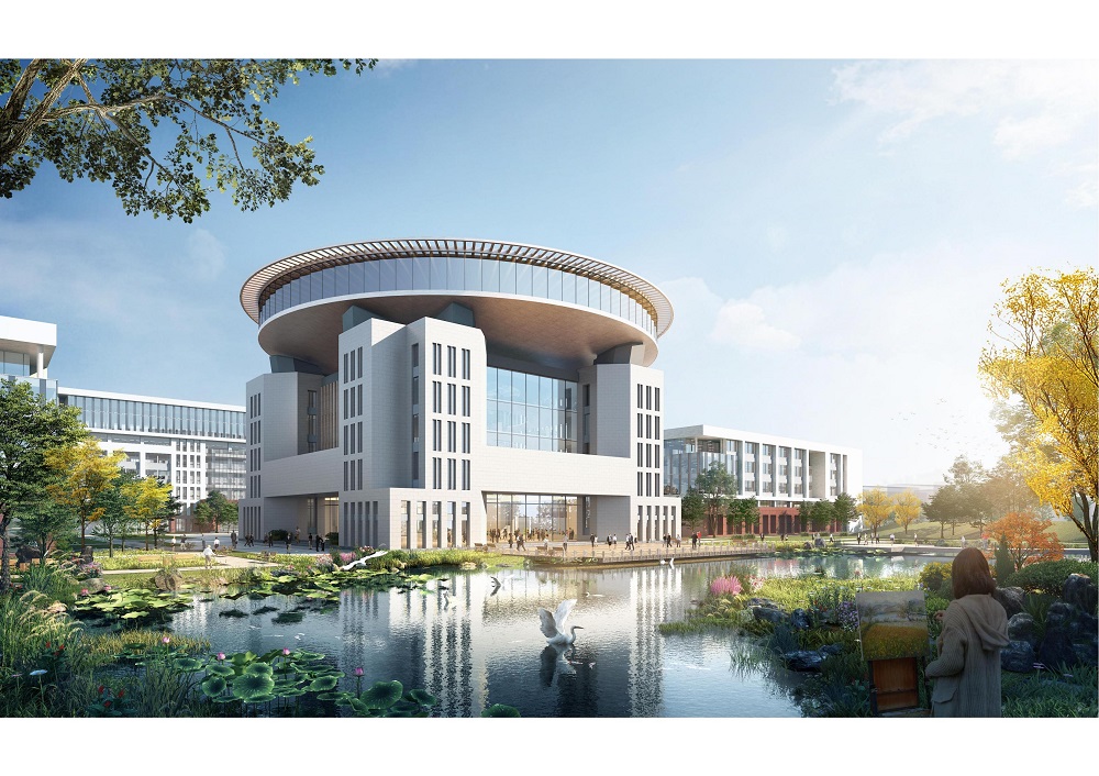 項目核心文化建筑:圖書館與圖書綜合樓,采用左右對仗形式設(shè)置于東西校區(qū)中心位置。圖書綜合樓以“圓”為頂;圖書館以“方”為體,體現(xiàn)“天圓地方” 的中國傳統(tǒng)宇宙觀 。