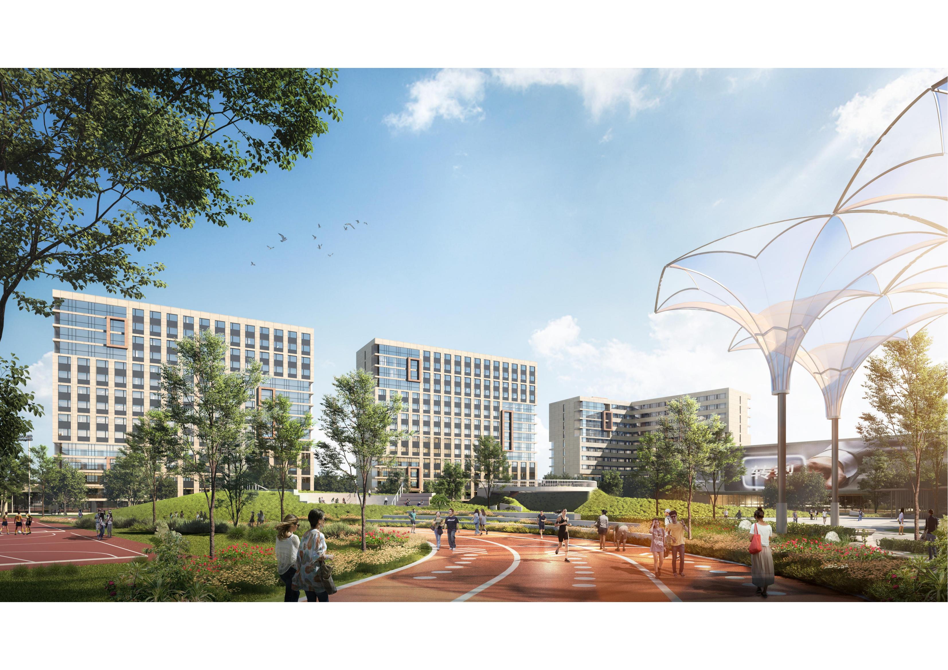 生活區(qū)景觀以“玉如意”為意向,勾勒出學(xué)生活動場地、體育運動場地、集會休閑場地等形象,連接?xùn)|西地塊,營造了活潑怡人的生活氛圍。