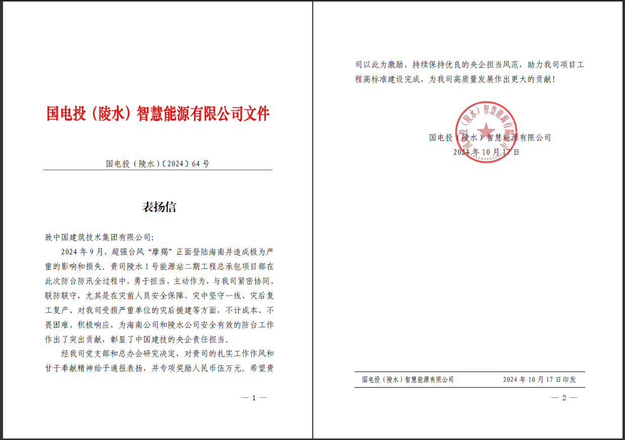 10月17日,中國建技收到國電投(陵水)智慧能源有限公司表揚信。對中國建技海南陵水1號能源站二期工程項目部在今年9月超強臺風(fēng)“摩羯”登陸海南期間,為防臺工作作出的突出貢獻給予通報表揚。