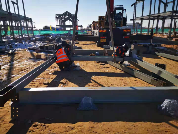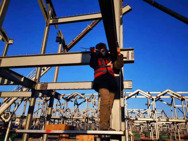 為確保工期,天津鋼結(jié)構(gòu)分公司負責人張衍雷以身作則,下基層,駐現(xiàn)場,第一時間解決遇到的困難和問題,確保重要工序24小時不停產(chǎn),為現(xiàn)場施工的有序進行提供了良好保障。在氣溫零下26度的施工現(xiàn)場,施工管理人員和安裝作業(yè)人員40余人冒著凜冽寒風,克服冬季白晝時間短、冰天雪地安裝難以施展等諸多困難,穩(wěn)步推進工程進度,充分展現(xiàn)了鋼構(gòu)鐵軍能打硬仗、吃苦耐勞的良好精神風貌。?