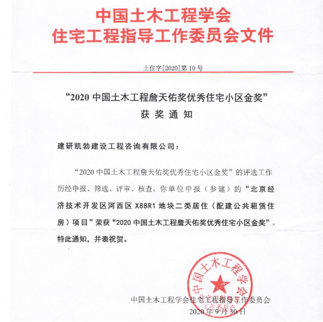 近日,建研凱勃建設(shè)工程咨詢有限公司(以下簡稱“建研凱勃”)監(jiān)理的北京經(jīng)濟(jì)技術(shù)開發(fā)區(qū)河西區(qū)X88R1地塊二類居住(配建公共租賃住房)項(xiàng)目榮獲2020中國土木工程詹天佑獎優(yōu)秀住宅小區(qū)金獎,這是繼該項(xiàng)目獲得北京市結(jié)構(gòu)長城杯金質(zhì)獎后的又一重大獎項(xiàng)。