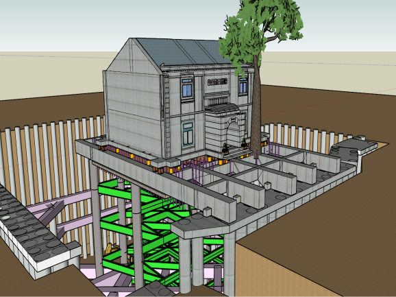 該建筑原為公安部辦公樓,始建于民國(guó)時(shí)期,是西城區(qū)重點(diǎn)保護(hù)文物。建筑占地面積約400平方米,東西長(zhǎng)約15米,南北長(zhǎng)約14米,地上兩層,地下基坑深度達(dá)20米。在該地塊開(kāi)發(fā)過(guò)程中,需在建筑周邊及下方進(jìn)行基坑開(kāi)挖,同時(shí)西側(cè)地鐵19號(hào)線(xiàn)太平橋站B口的施工也在同步進(jìn)行。為確保歷史建筑的安全,項(xiàng)目團(tuán)隊(duì)對(duì)其進(jìn)行了原址托換處理。