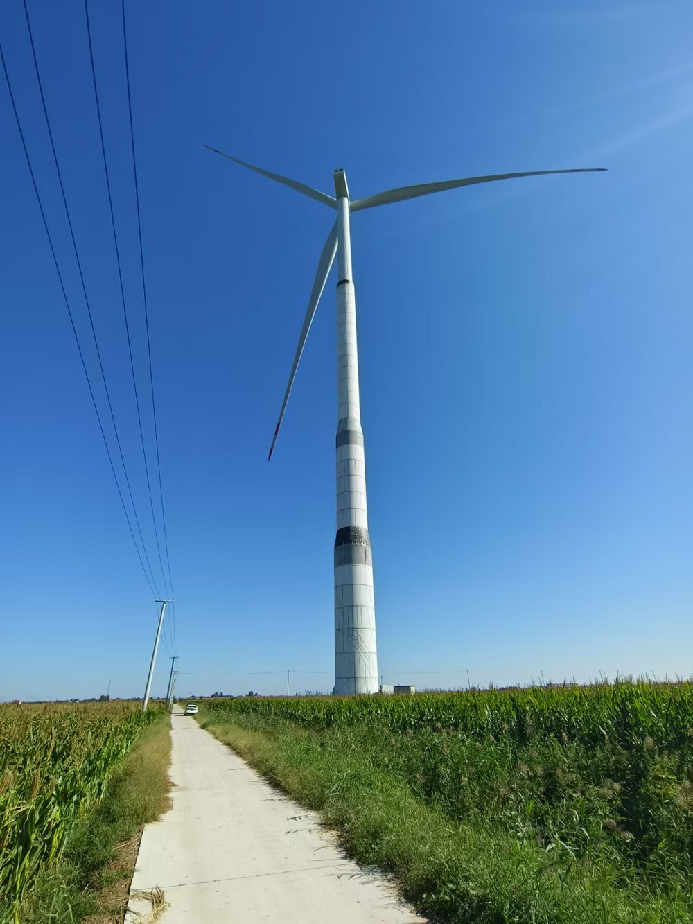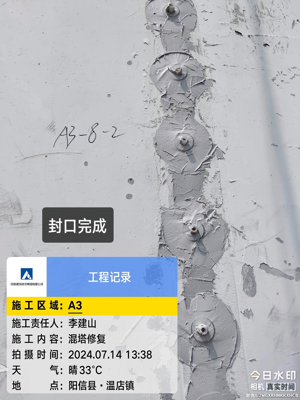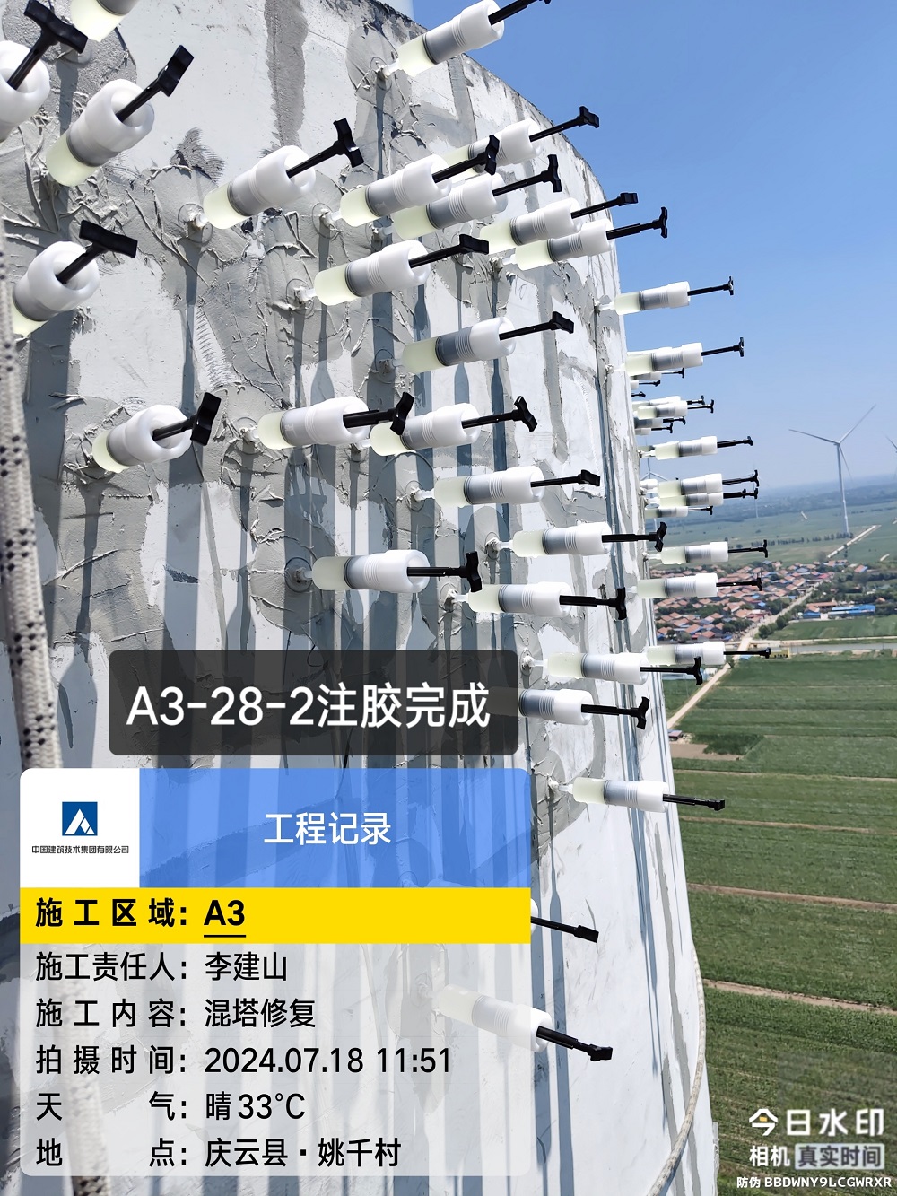山東省德州市的中廣核慶云尚堂風(fēng)電場位于山東省德州市慶云縣尚堂鎮(zhèn)。WD195-5000型風(fēng)電機(jī)組,混凝土部分為預(yù)制裝配式結(jié)構(gòu),混塔總高110.03m,共28層。M01~M26高3.99m,M27高3.60m,M28高2.4m。M01~M07外徑7800mm,M09~M14外徑6600mm,M16~M28外徑5400mm,M08、M15為過度節(jié)段。除門洞位置外,M01管片壁厚為300mm,M02~M27管片底部壁厚300mm,M28管片底部壁厚1050mm。M01~M15各由兩個C型管片組成,通過豎縫插筋連接并灌漿,組成完整O型管片。管片M16~M28為完整的預(yù)制O型管片。我單位需對塔筒節(jié)間縫隙重新補(bǔ)膠,并對個別塔進(jìn)行空鼓、掉塊及裂縫進(jìn)行修復(fù)。